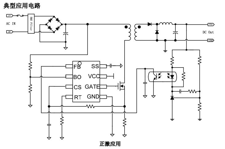 线电压欠压保护:线电压欠压保护通过监控 BO 引脚上的电平,控制器可以保护正转换器免受低输入电压条件的影响。 当 BO 引脚电平低于 VBO电平时,控制器停止脉冲,直到输入电平恢复正常,并通过新的软启动顺序恢复运行。欠压比较器具有固定的比较电压(VBO)。当 BO 引脚低于内部电压(VBO)时,通过使用连接在 BO 引脚和地之间的内部电流实现迟滞。